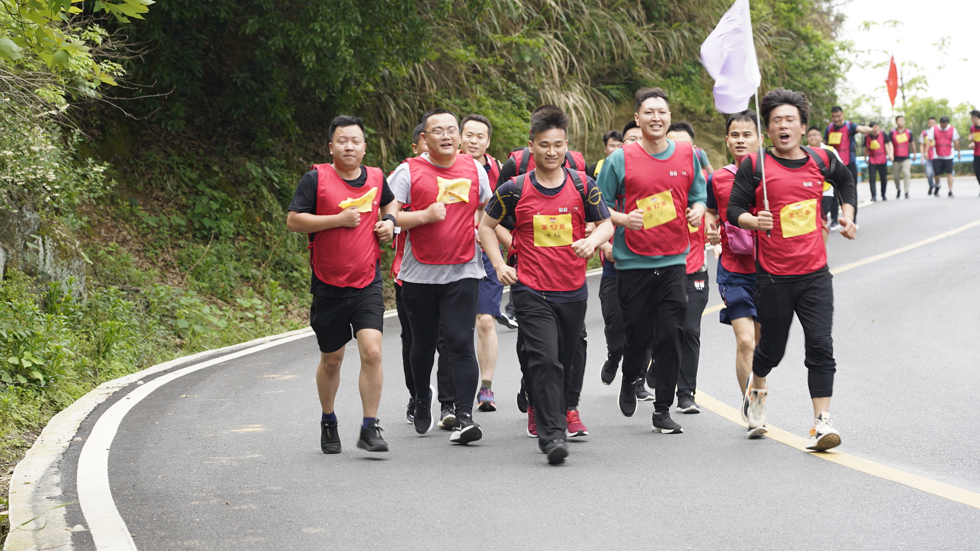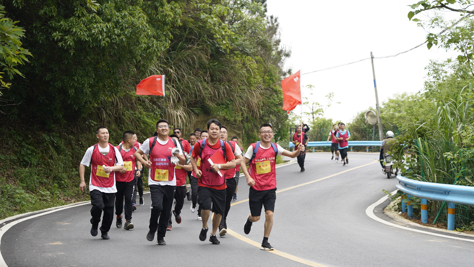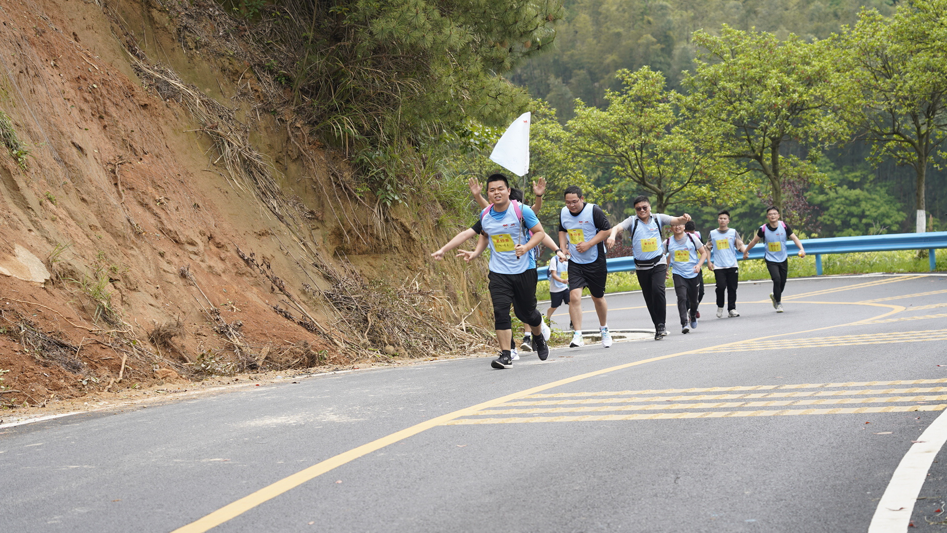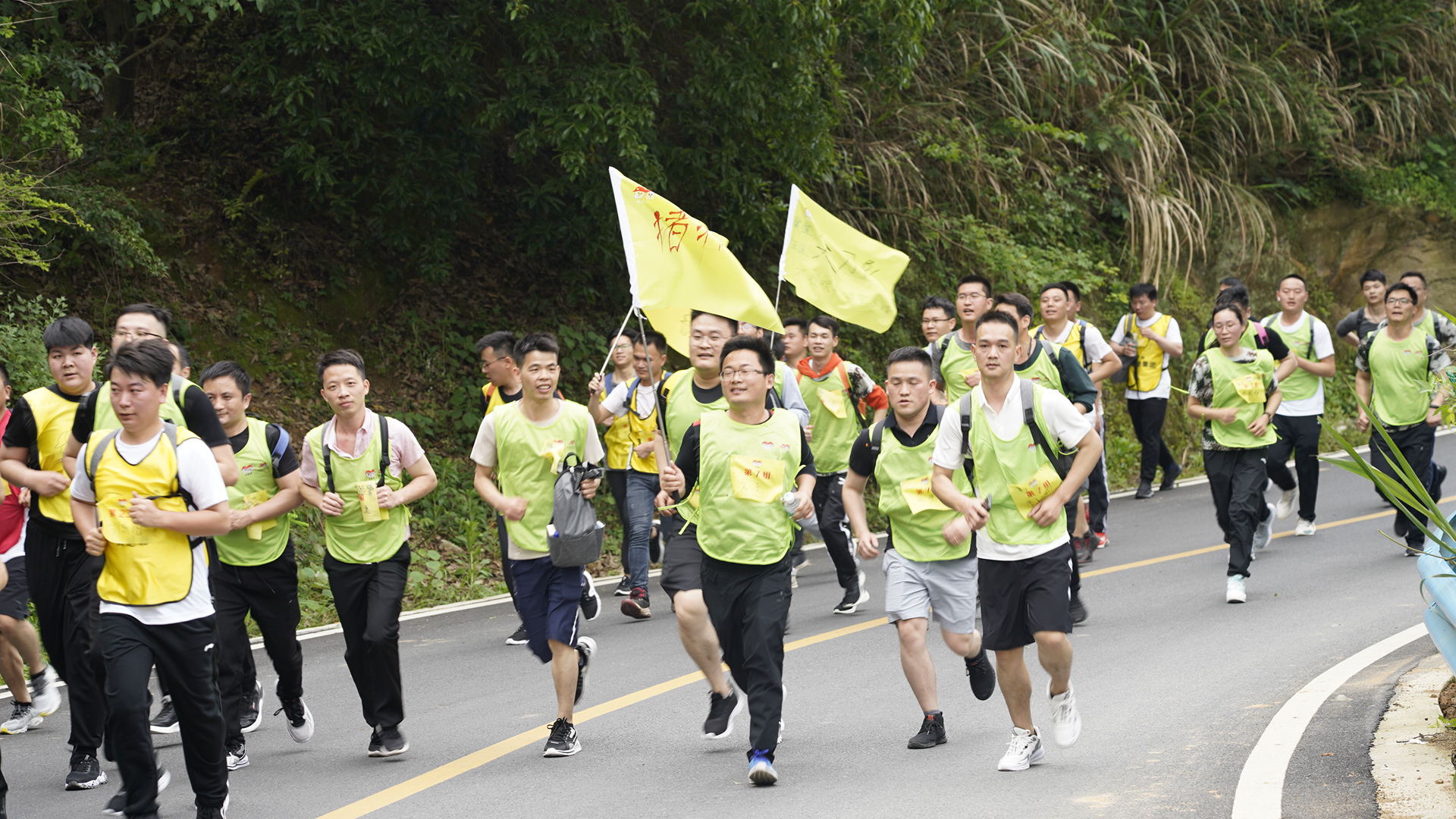 本次徒步前17公里为铜源峡幸福水库-梅岭洗药湖上山路段,山路蜿蜒,落差近600米,路况颇具难度。大家充分发挥团队精神,紧跟各组旗手,迈开步伐,迎难而上。山里不时传来整齐的口号,各小组你追我赶,奋勇争先。