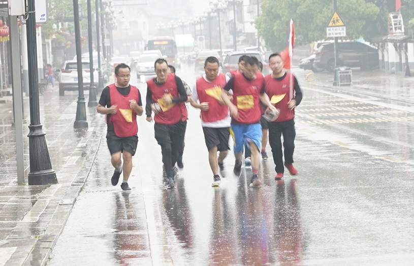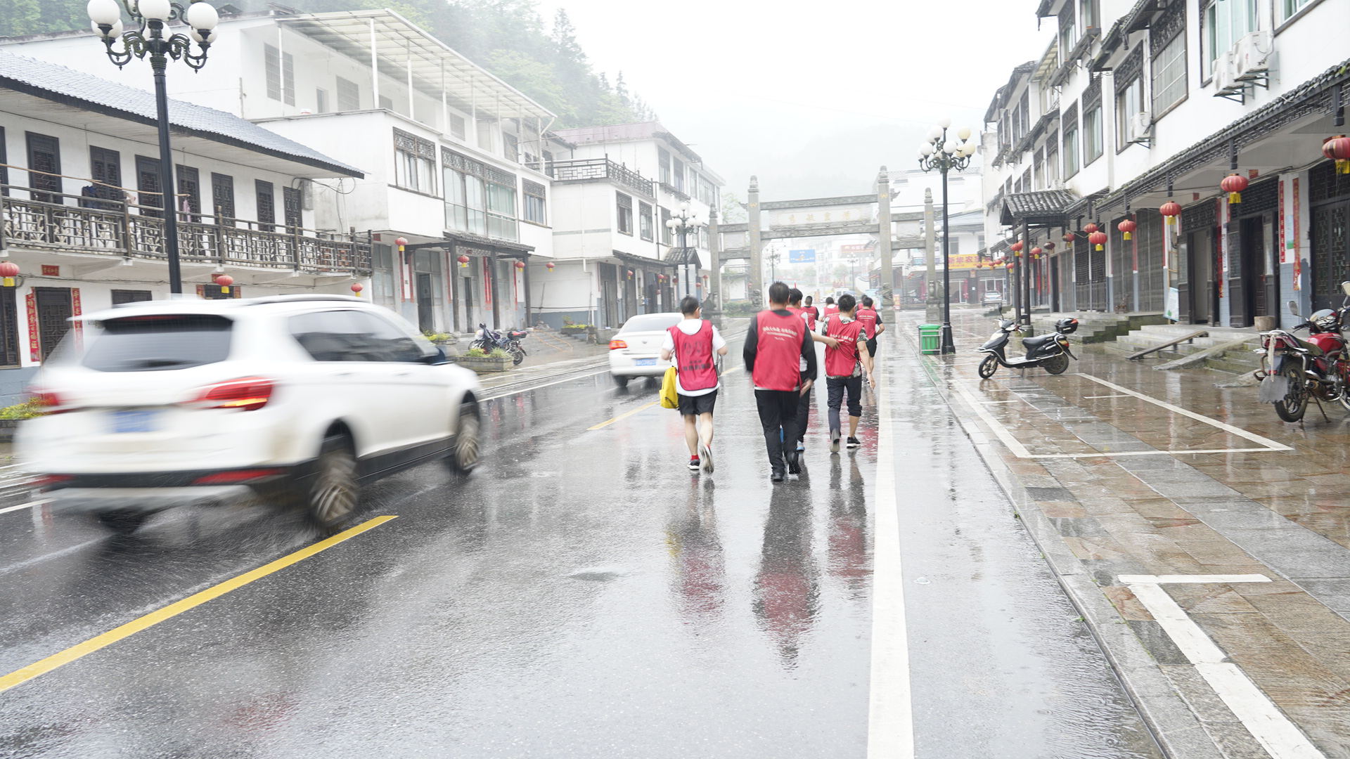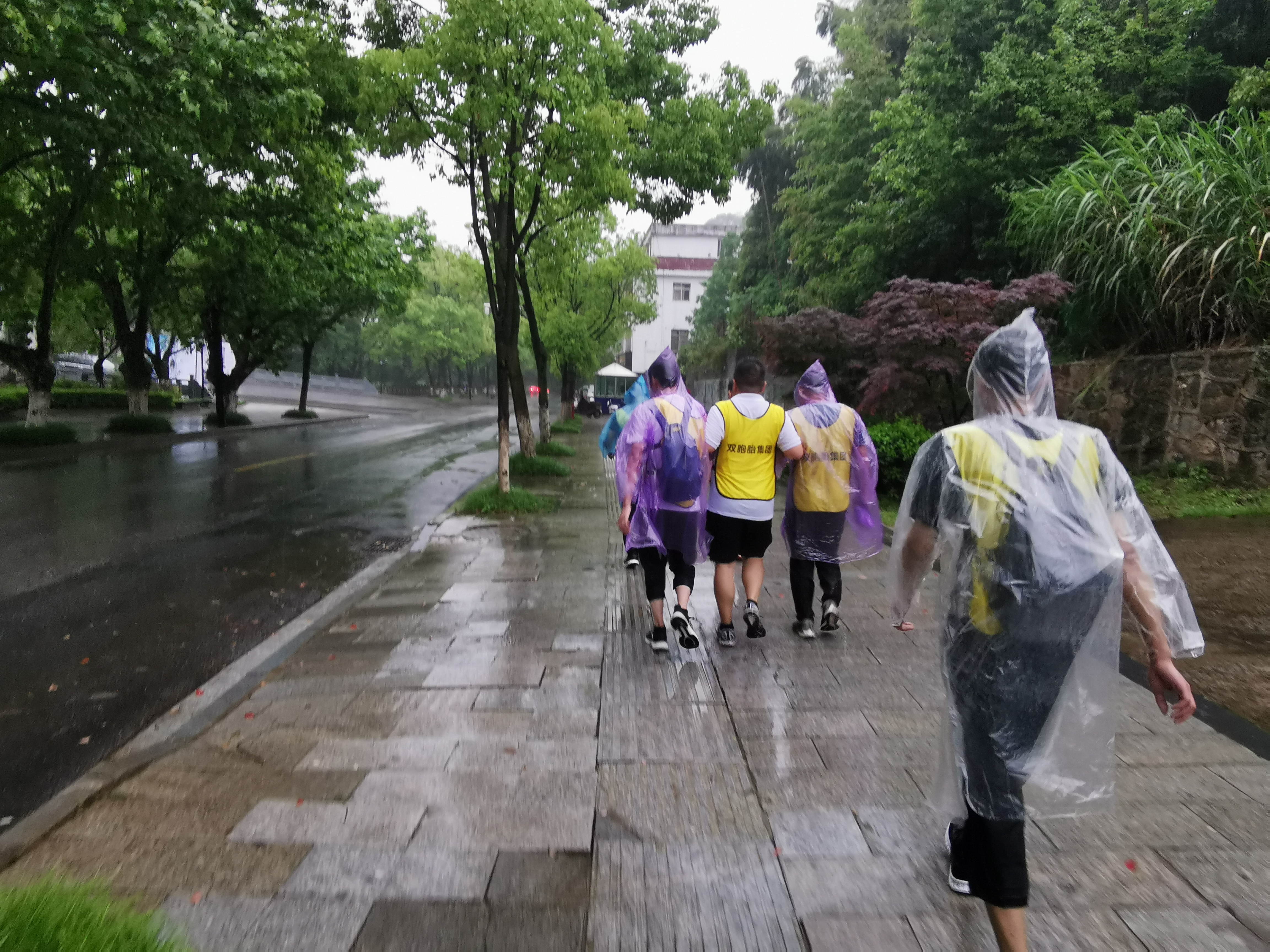 下午雨势逐渐变大,各小组收拢人员,穿上雨衣,冒雨继续前进,不屈的队旗,沉稳的步伐,成了雨中独特的风景线。