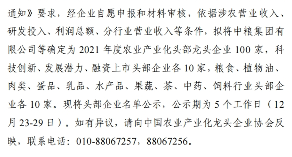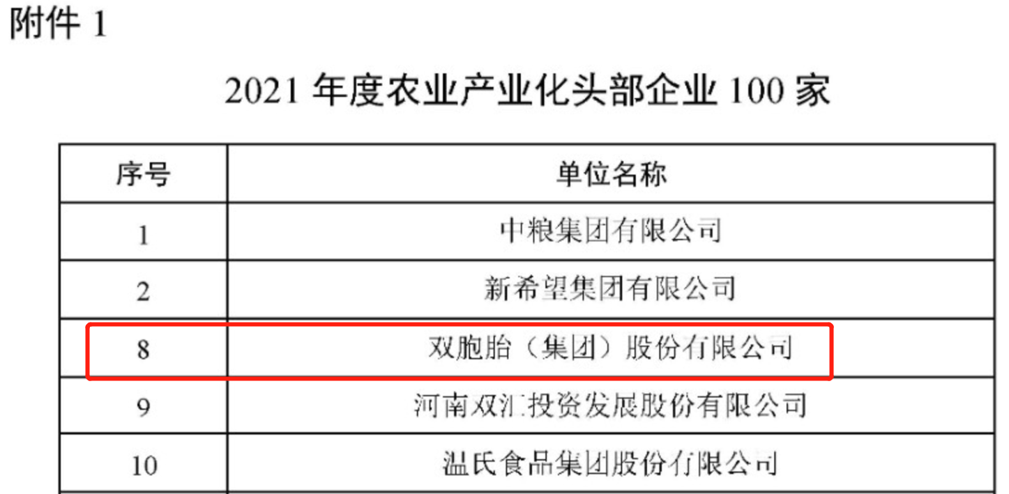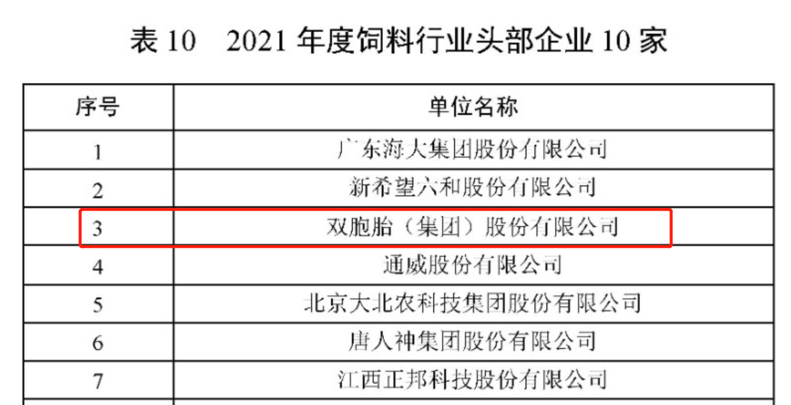 12月23日,经企业自愿申报和材料审核,依据涉农营业收入、科研投入、利润总额、分行业营业收入等条件,中国农业产业化龙头企业协会公示了2021年度农业产业化龙头企业100家、科技创新等头部企业各10家、饲料等行业头部企业各10家。双胞胎集团分别位列2021年度农业产业化头部企业100家第8位、2021年度饲料行业头部企业10家第3位。