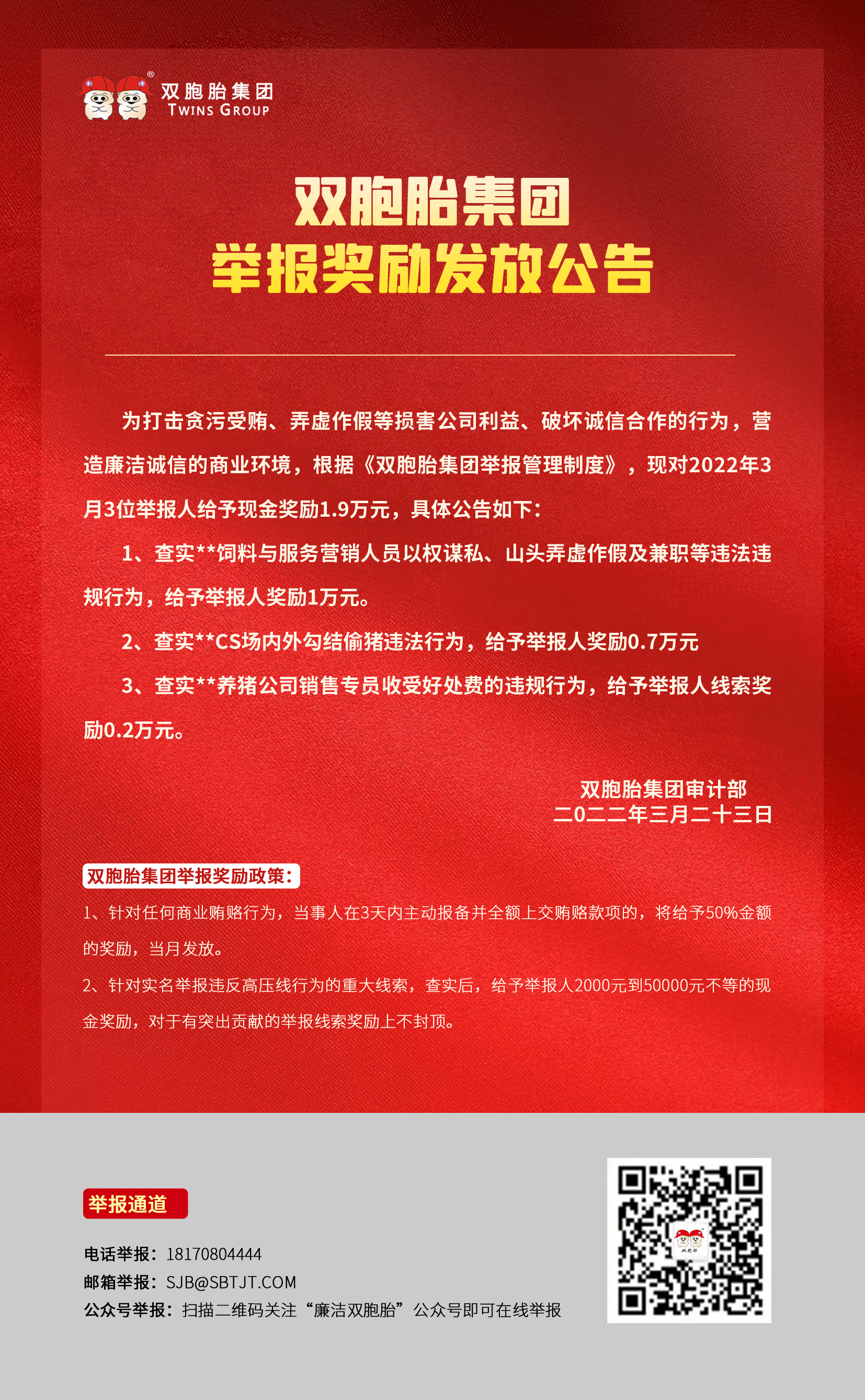 双胞胎集团举报奖励发放公告