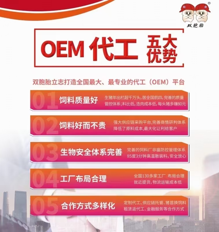 双胞胎立志打造全国最大最专业的代工平台!双胞胎代工(OEM)具有饲料质量好、饲料好而不贵、生物安全体系完善、工厂布局合理、合作方式多样化五大优势,已具备了为广大养猪企业提供定制化代工(OEM)和养猪服务解决方案的实力和能力,目前越来越多的全国众多知名养猪企业与双胞胎集团合作,实现强强联合,互惠共赢!