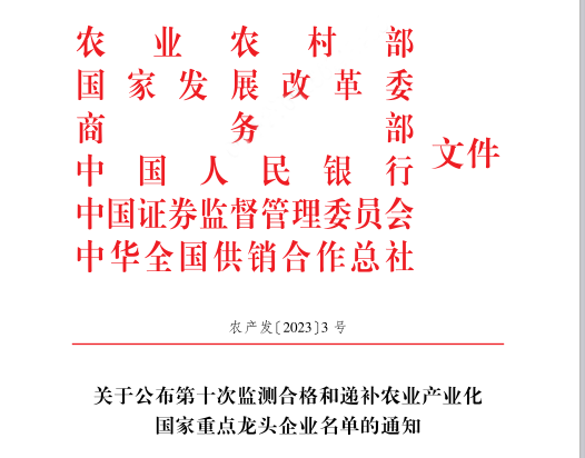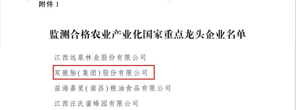 近日,农业农村部公布第十次监测合格和递补农业产业化国家重点龙头企业名单,包括双胞胎集团在内的1429家农业产业化国家重点龙头企业监测合格,继续保留农业产业化国家重点龙头企业资格。