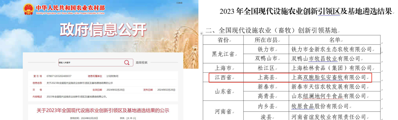 2月28日,农业农村部公布2023年全国现代设施农业创新引领区及基地遴选结果,双胞胎集团上高双胞胎弘安畜牧有限公司入选畜牧创新引领基地。